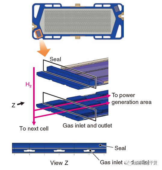 尽管一个双极板就有有进出口来给电化学反应提供气体,但通常需要给双极板粘贴或附上不同形状的金属或者树脂部件。然而夹紧不同形状的金属或者树脂部件工艺提高了电池成本。因此橡胶也用来成形气体进出口区域(rubber was used in forming the fluid inlet and outlet)。如下图所示,通过桥墩结构(bridge pier structure),反应气体进出口与隔开阴阳极反应气体的密封圈相交。