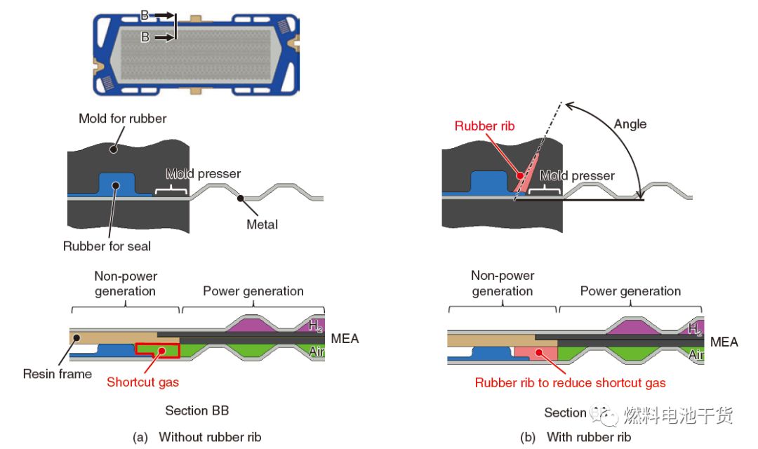 下面将介绍使用肋(rib)结构来防止部分反应气体在部件之间窜动的原理。如下图所示,当在冲压成型的金属双极板上对密封圈进行浇铸(mold)成形时,模具正压金属板,需要一个模具压紧机械装置(下图中的mold presser)防止橡胶材料外流(成形过程中橡胶材料被挤出来)。金属和模具紧密接触,橡胶成型过程中可能产生孔隙。当不参与电化学反应的气体进入上述孔隙中,电化学反应效率降低。为了解决这个问题,密封圈中加入图中所示的肋。