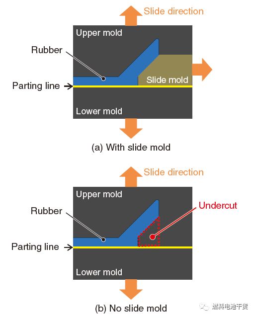 仅仅通过上下两个模具来进行密封圈形状塑造仍有欠缺。由于存在冲压部件,一个滑动模具(下图中的slide mold)在肋成型过程中定位不够精确。因此,本田在研究了肋的角度后,建立了一个简易的molded shape来通过无损耗的two-way extraction方法使橡胶可以移动,该方法不需要使用滑动模具,称其为“forced extraction”。(英文:Uneven shapes from which moleded shapes cannot be removed simply by splitting the mold in two are generally called "undercut" as illustrated by the slide mold shown in below figure in which the mold is split. However, a slide mold cannot be situated near rib forming since there exits press-formed parts. In this development, the angle of the rib was studied and an easily moled shape was established to enable rubber to be removed by two-way extraction mold without being damaged and without the use of a slide mold, by a method called "forced extraction")。