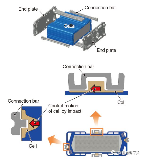 为了将燃料电池电堆置于引擎盖下方,由于碰撞发生时对电堆的冲击力加大,抗冲击性应该提高。碰撞发生时,施加在层叠结构的电堆双极板上的冲击力会引起电堆相关部件的偏移和误差。因此,配置连接燃料电池电堆左右端盖的连接杆很有必要,并且电池上的凸起部位与连接杆的凹部相啮合。金属双极板四周有锯齿状的结构,由于锯齿状的结构采用高强度的树脂注压在双极板上形成一个整体结构,连接杆和双极板之间的高压双极板导电隔离从而可以保证。