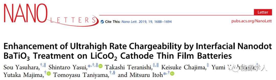 Sou Yasuhara, Shintaro Yasui, Takashi Teranishi, Keisuke Chajima, Yumi Yoshikawa, Yutaka Majima, Tomoyasu Taniyama, and Mitsuru Itoh, Enhancement of Ultrahigh Rate Chargeability by Interfacial Nanodot BaTiO3 Treatment on LiCoO2 Cathode Thin Film Batteries, Nano Lett., 2019, DOI:10.1021/acs.nanolett.8b04690