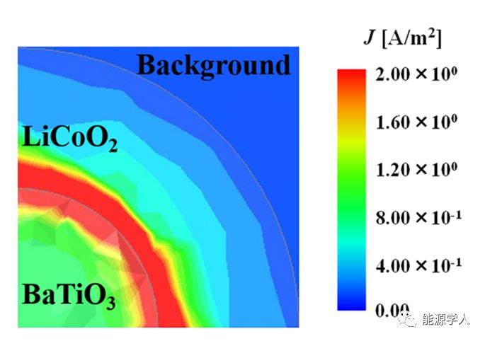 作者首先利用ANSYSHFSS软件计算出了纯LCO表面、和BTO修饰LCO表面的电流密度。结构模型由LCO、电解质、BTO和SEI组成,如上图所示。