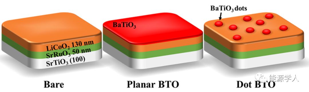 为了在实验上支持这一计算结果,作者制备了三种类型的正极模型:没有BTO的裸正极(Bare),平面型正极(PlanarBTO),点型正极(Dot BTO),如上图所示。作者以外延薄膜正极为模型,是因为在厚度相同时,晶体平面(例如多晶层)和晶粒尺寸的差异可以忽略不计;并且也适用于模拟实验。Dot BTO具有最好的倍率性能,Planar BTO和Bare型正极次之,这是因为Dot BTO具有良好的三相界面TPI,而其它两种没有。薄膜正极均通过脉冲激光沉积(PLD)制备,叠层结构为BTO/LCO/SrRuO3(SRO)/(100)SrTiO3(STO),单晶STO可以作为基底,让所有薄膜进行外延生长。SRO为集流体,由于在真空条件下沉积时锂会蒸发,因此作者采用了锂60%过量的陶瓷(Li1.6CoO2)进行靶向沉积。在沉积过程中,通过调整氧分压p(O2),可以控制两种类型的BTO在LCO薄膜上生长:p(O2)为200 mTorr时,沉积结果为layer-by-layer生长;p(O2)为2 Torr时,实现岛状生长。layer-by-layer生长的正极为平面型(Planar BTO),岛状生长的正极为点型(Dot BTO)。