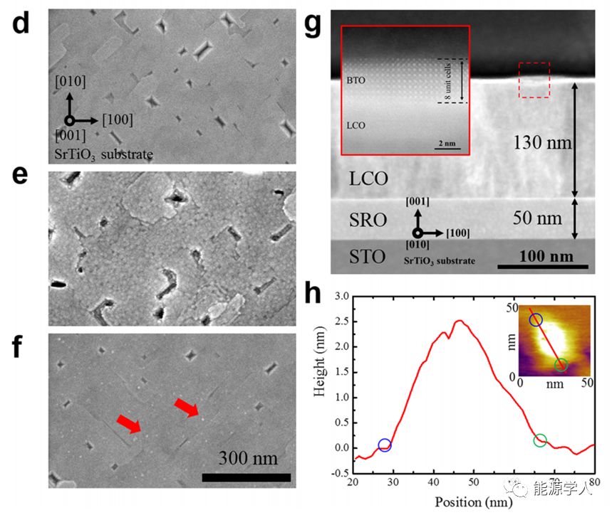 为了更直观的表示LCO薄膜上沉积的BTO,作者在上图中给出了电极平面和横截面的扫描电子显微镜(SEM)图像。上图d-f分别显示了裸BTO、平面BTO和点BTO的LCO表面图,很明显,在图e中可以看到BTO薄膜,而图f中的红色箭头所指的白点为BTO。与此相反,裸电极上既没有观察到颗粒也没有观察到点(图d)。为了确定沉积薄膜的晶体结构和化学成分,作者观察了平面BTO的横截面图、以及HAADF-STEM图像。图g显示了LCO、SRO层和STO基板的横截面图,可以看到LCO和SRO层中的膜厚度分别约为130和50 nm。图g中的插图显示了在BTO和LCO层界面周围测量的高分辨率HAADF-STEM图像,如红色虚线正方形所示,上层为BTO,底层为LCO。从图中可以明显的观察到具有立方形单晶的Ba,以及Ti原子对应的清晰亮斑和暗斑。然而,由于LCO中的菱形结构和BTO中的四方或立方结构的对称性差异,因此在LCO中没有观察到斑点。BTO层由八个堆叠的单元晶胞组成,表明BTO的厚度为~3 nm,BTO纳米点的表面覆盖率小于5%。