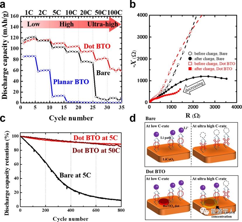 随后作者比较了平面型BTO和点型BTO的电化学性能,上图a显示了放电容量随循环次数的变化。可以看出,裸正极的放电容量随着C-倍率的增加快速下降,50 C时的容量几乎为零,平面型BTO正极的放电容量在10C下急剧下降,同样几乎为零,这表明在50C和100C的超高倍率下,平面型BTO正极和裸LCO正极都不能作为可充电正极。出现以上情况的原因在于,均匀涂层的BTO薄膜会阻止Li+通过BTO层嵌入/脱出,尽管还是会有少量的Li+存在于BTO薄膜中,由于晶界电阻率较高,Li+可以以较低的倍率进行插入/脱出,但不能以较高的倍率运行。另一方面,在1C和2C时,Dot BTO的放电容量几乎与裸LCO相同。而随着充电倍率增加到50C和100C,Dot BTO正极仍具有良好的电压平台,这意味着该正极的电化学反应进行得很好。