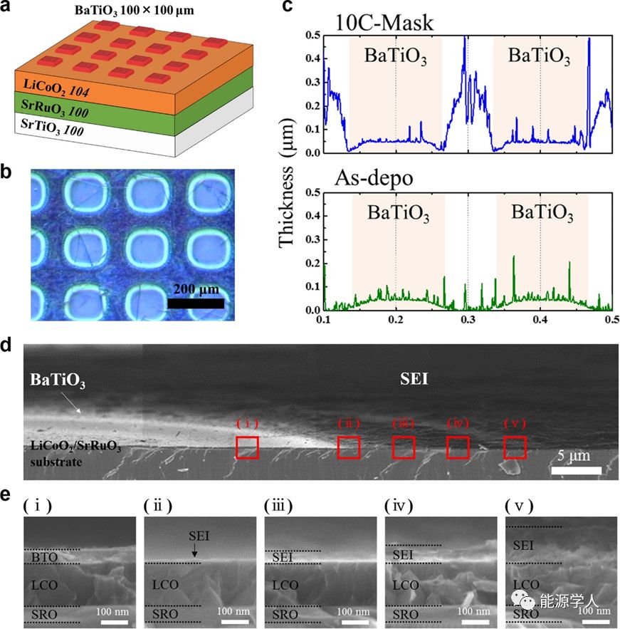 以下整个解释是围绕SEI展开的。为了研究三相界面TPI(BTO-LCO-electrolyte三相界面, 简写为TPI))在提高倍率性能中的作用,作者对其进行了充放电后的扫描电镜测量。然而,由于Dot BTO尺寸较小,故而不能直接观测,因此不适用于本实验。为了清楚地找到TPI区域,作者通过阴影掩模在LCO上沉积了具有100μm平方面积和50nm厚度的外延BTO盘,如上图a所示(猜测:大概意思是斑点BTO很难被观察到,所以作者想了个这种的办法,外延生长BTO,使其部分覆盖LCO表面。这样不仅可以模拟Dot BTO的结构,而且还能使用仪器进行表征)。