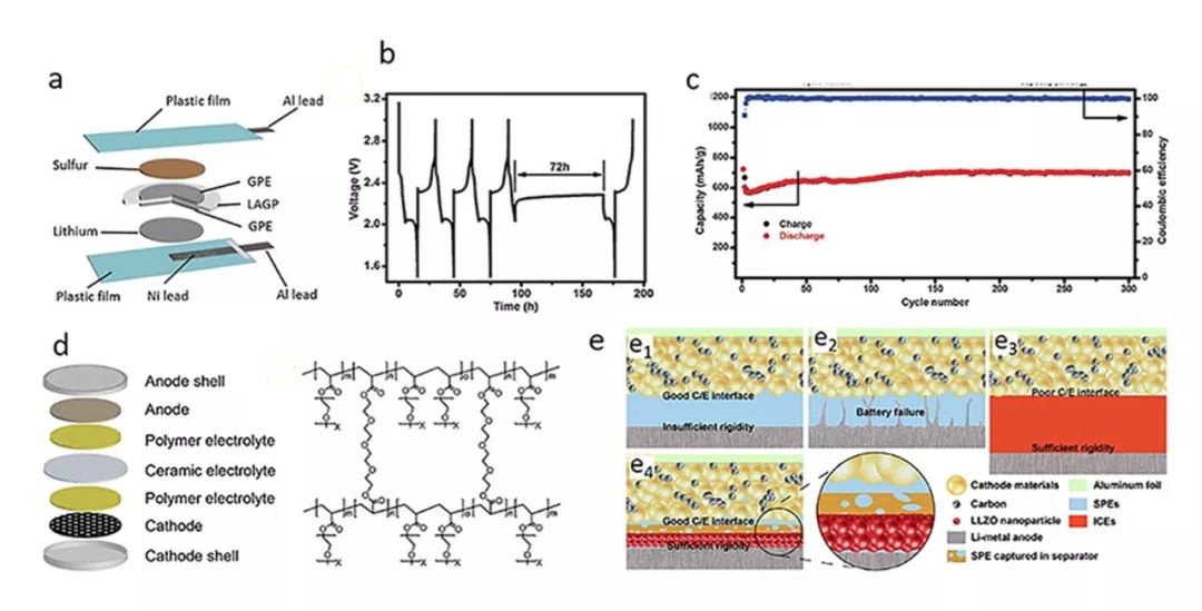 (e)固态锂金属电池聚合物电解质(e1和e2)、无机陶瓷电解质(e3)和聚合物-无机复合固态电解质(e4)结构示意图。