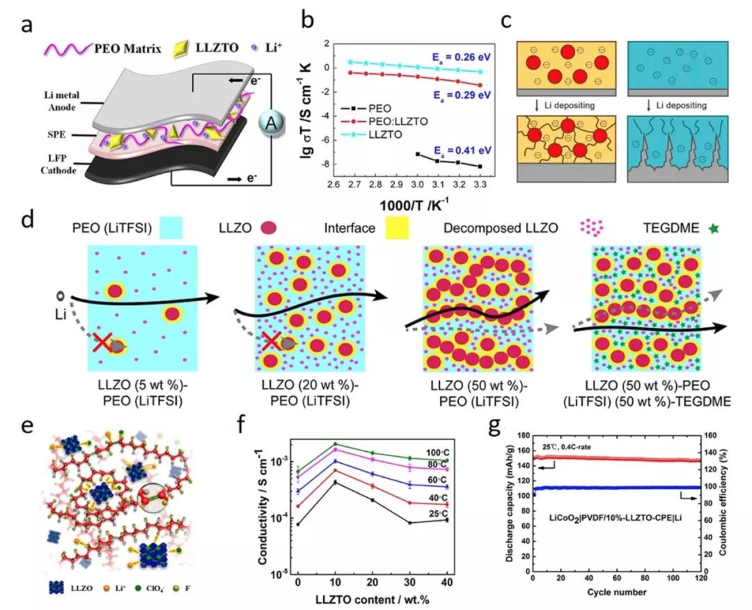 (e-f)PVDF/LLZTO-CPEs复合固态电解质结构(e)离子导电率随LLZTO含量变化(f)和组装电池的循环性能图(g)。