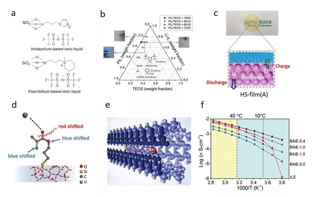 (d、e)BAIE(类蚁巢复合固态电解质)-1.0 中无机基体与液态组分间的相互作用(d)和锂离子迁移路径(e)示意图;