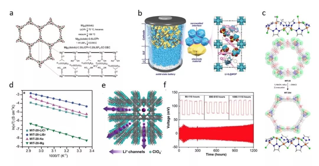 图6.(a)Mg2(dobdc) MOF结构示意图(dobdc为该MOF配体);(b)MOF-IL复合固态电池的结构及界面润湿示意图;(c)阴离子型框架材料的制备及MIT-20(上)和MIT-20d(下)的晶体结构;(d)MIT-20-LiCl、MIT-20-LiBr、MIT-20-Na和MIT-20-Mg的离子电导率随温度的变化关系;(e-f)键合ClO4–离子的MOF框架中的仿生离子通道(e)和使用该电解质的对称锂金属电池循环稳定性。
