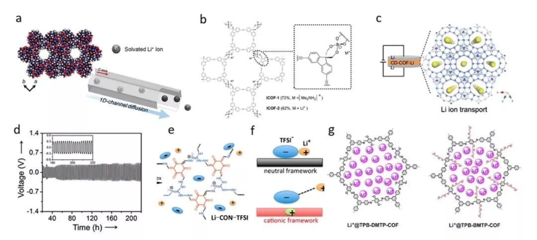 (g)未修饰和长链烷氧基修饰的Li+@TPB-DMTP-COF结构示意图。TPB:1,3,5-三(4-氨苯基)苯;DMTP:2,5-二甲氧基苯-1,4-二甲醛。