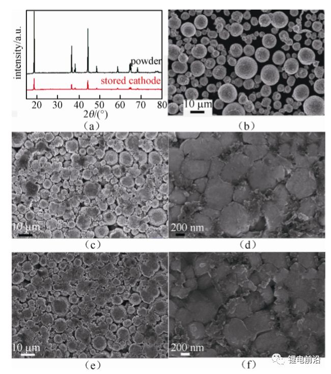 图2 (a)NCM811 材料和存储后正极的 XRD 谱;(b) NMC811 材料的 SEM 照片;(c)和(d)为存储前(BOL) 正极的 SEM 照片;(e)和(f)为存储后(EOL)正极的 SEM 照片