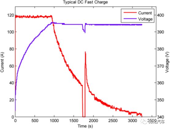 Leaf 50kW的快充过程,快充在1725秒后会自动结束,然后再开始另一次充电直到电池完全充电。