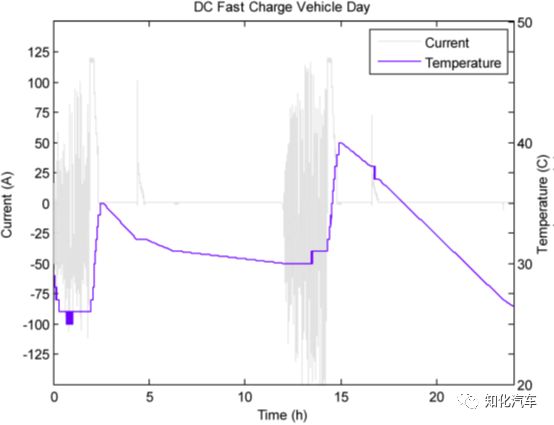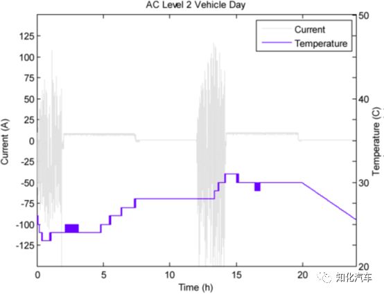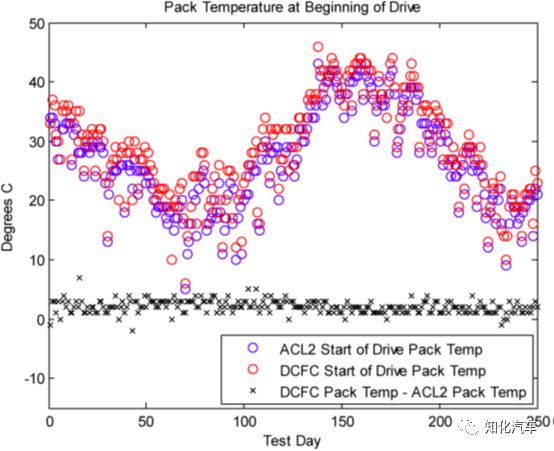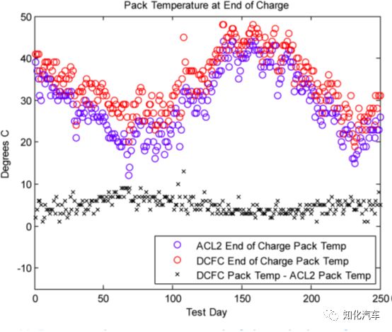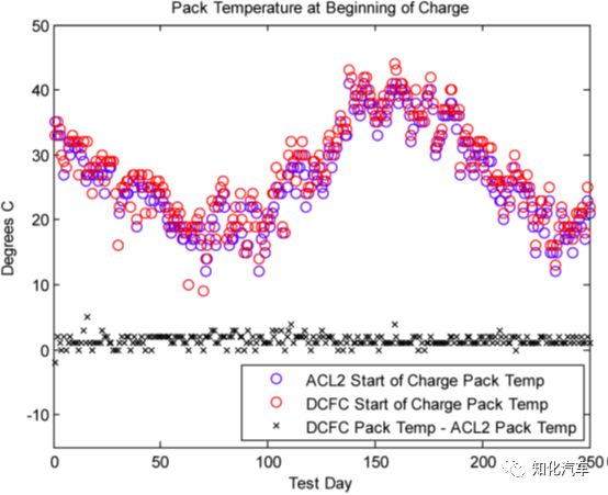对于电量耗尽,每次进行充电前的电池包温度如下图,可知,直流快充(DCFC)的车辆与ACL2的车辆温差进一步减少。在行驶的过程中,直流快充(DCFC)车辆电池包温度平均冷却了1.1℃,ACL2车辆的电池包平均冷却了0.4℃,因此,在车辆行驶过程中,DCFC的车辆电池包温度平均比ACL2电池包温度高1.4℃,基本可以忽略不计。