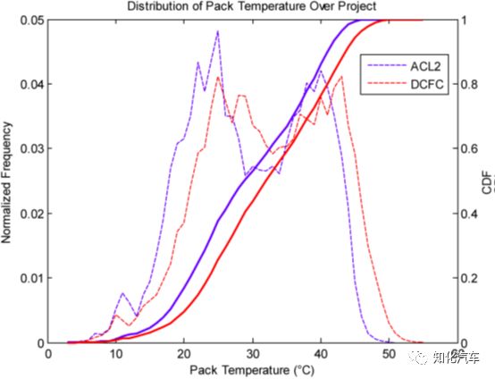 对整个测试过程中,两组电池包的温度进行统计分布,显示如下,可以看出,车辆95%的时间(包括行驶,充电,静止)电池包的温度不会超过46℃。
