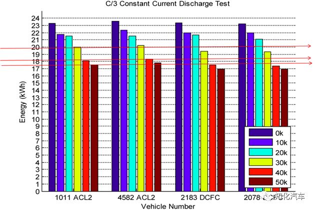 45MPH(72km/h)等速测试的续航里程与容量如下表所示,4辆车在5万英里(8万公里)后,续航里程都呈现的较大程度的衰减,直流快充平均下降30%,ACL2车辆美元下降21.5%。同比,容量衰减也是很大的比例。