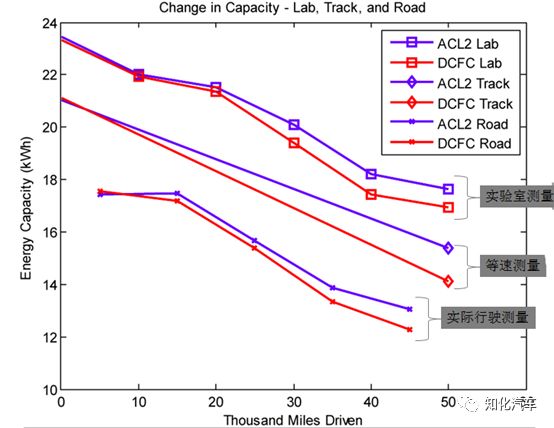 进一步对比不同条件下的容量测试,实验室为C/3测试条件,Track测试为等速测试,直到不能维持车辆的速度(最大限度的利用电量),Road测试为正常的行驶,从满电开始,当提示还剩下5英里续航电量时停止(有一部分电没有利用)。