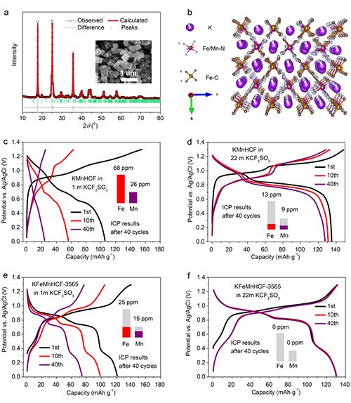 图1. Fe取代富锰普鲁士蓝正极材料的结构与性能优化。(a)Fe取代的KFeMnHCF-3565正极材料的XRD精修图;(b)具有P21/n空间群的KxFeyMn1-y[Fe(CN)6]w·zH2O典型结构图;(c-f)无取代材料(KMnHCF)和有Fe取代的材料(KFeMnHCF-3565)在1mol/L和22mol/L三氟甲基磺酸钾电解液中的电化学以及过渡金属溶解情况。