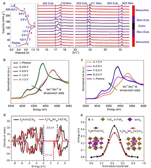 图2. Fe取代的KFeMnHCF-3565正极材料性能提升的机理。(a)充放电过程中结构演化;(b-c)Mn2+/Mn3+ 氧化还原电对的电荷转移机制;(d-e)第一性原理计算无Fe取代模型结构K2MnFe(CN)6和有Fe取代的模型结构K2Fe0.5Mn0.5Fe(CN)6的电子能态密度(d)和钾离子的迁移活化能(e)