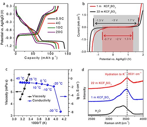 图3.(a)有机负极PTCDI的电化学性能;(b-d)分别为22mol/L三氟甲基磺酸钾电解液的性能的窗口(b)、粘度/电导率(c)和拉曼光谱图(d)。