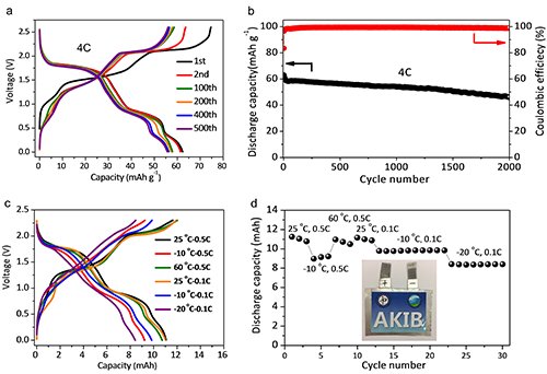 将开发的正、负极材料和高盐浓度电解液组装成水系钾离子全电池,发现其可以在0到2.6 V电压区间内运行(图4a),其理论能量密度可达80 Wh/kg,寿命可达2000次以上(保持率73%)(图4b)。值得一提的是,作者还组装了11 mAh的水系钾离子软包电池,并演示了软包电池良好的低倍率(0.1C和0.5C)和高低温(-20-60 ℃)性能(图4c-d)。