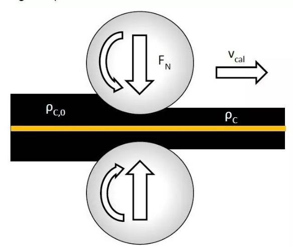 电池极片的轧制不同于金属板材的轧制,比如轧钢的过程是一个板材沿纵向延伸和横向宽展的过程,其密度在轧制过程中不发生变化;而电池极片的轧制是一个正负极板上电极粉体材料压实的过程,其目的在于增加正极或负极材料的压实密度。