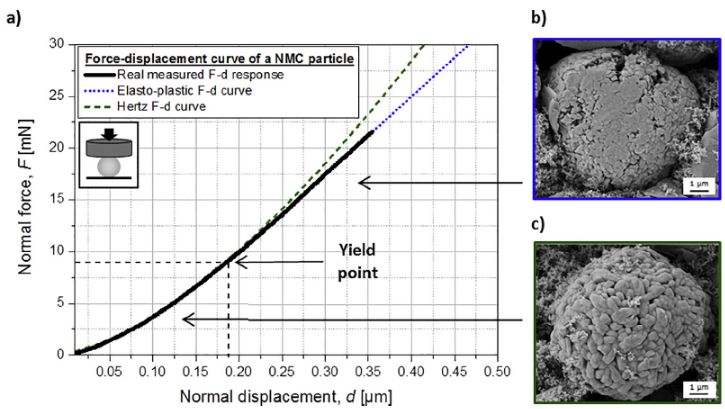 图2 单个NMC颗粒纳米压痕测试结果。(a)应力-应变曲线,(b)屈服点以上颗粒形貌,(c)屈服点以下颗粒形貌,(d)屈服应变与颗粒尺寸关系。
