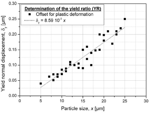 首先,作者采用纳米压痕设备测试了单个颗粒的压缩载荷应力-应变曲线,并采用两种材料本构模型拟合数据:弹塑性模型和Hertz模型,结果如图2所示。从应力-应变曲线确定材料屈服点,屈服点以下材料主要是弹性行为,颗粒形貌基本无变化(图2c),符合Hertz理论;屈服点以上,材料是塑性行为,颗粒发生断裂(图2b),符合弹塑性理论。通过大量实验,拟合了屈服应变与颗粒尺寸的关系(图2d)。