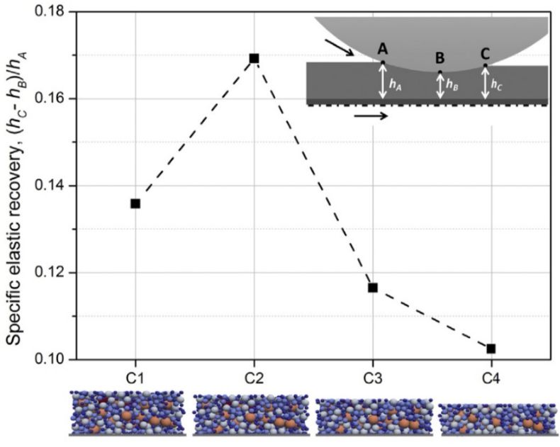 文章还考察了极片回弹,极片厚度回弹率定义为(hC-hB)/hA,结果如图7。压实比较小时,颗粒之间相互接触小,积累的弹性变形少,回弹小。压实增加,弹性变形增加,回弹增大,C2极片回弹最大。继续增加压实,颗粒应变达到屈服点以上,弹性恢复也减小了(与之前认识不同:压实越大回弹越大)。