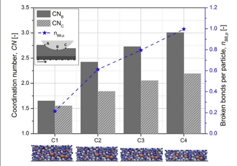 固相颗粒之间相互接触到电子传导,粘结性能影响涂层结合强度。作者考察了辊压模拟微结构中颗粒相互接触。单个颗粒平均接触点数CN定义为模型中所有接触点数目nc与颗粒个数np的比值。