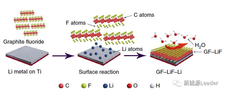 在充满氩气的手套箱里,锂片经过纯化后,在钛箔上加热至250℃,获得熔融的锂金属。在熔融的金属锂中缓慢放入氟化石墨,不停的搅拌直到混合均匀,然后静置3小时。静置时,高温状态下,氟化石墨粉末会漂浮在锂金属表面形成均一的涂层。锂金属会缓慢和氟化石墨反应在两者界面上生成GF-LiF保护层。冷却后,GF-LiF-Li合成材料就可以移出手套箱,切成组装电池需要的形状。这层薄膜柔韧性很好。