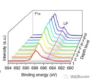 通过详细的密度泛函数计算可以证明Li和GF可以发生反应。简化后的四种分子模型和晶体参数如图1中所示,氟化石墨与锂接触时被还原成成LiF和石墨烯,锂原子会自发的嵌入,每嵌入一个锂原子就会有4.133eV的能量被释放出来。对GF-LiF层做X光电子能谱图分析,得出了表面化学成分和内部立体元素分布。对GF-LiF-Li做光电子能谱分析,其表面含有F,O,C和Li元素,利用高分辨率的XPS分析F 1s在GF-LiF膜中最表面和最里层分布,数据显示在约687.8eV处有峰,来自C-F键。约685eV处的峰来自Li-F键。这说明GF是这个膜层的主要成分。对F 1s光谱随着膜层的深度分析发现,随着深度增加,LiF对应的峰的强度增加,说明膜层越接近锂金属,LiF含量越高。为了检测是否有碱金属暴露在膜层表面,又对膜层表面的区域部分进行Li 1s 光谱的XPS测试,见图2,并没有发现有锂金属对应峰出现,说明膜层的保护性很好。同时利用聚离子束扫描显微镜对GF-LiF-Li合成材料进行断层分析,可以看到有三层分布,最外层是GF-LiF层,中间层是过渡层,包括GF,LiF和Li金属,最底层是锂金属层。能量色散x光谱仪(EDX)也验证了这一现象。