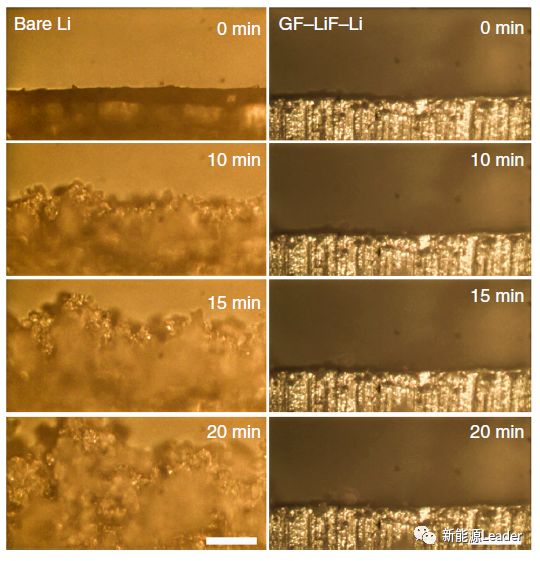 带有GF-LiF膜的锂金属能够有效避免锂枝晶生成,这个过程也通过场发射电子显微镜得到证实。在GF-LiF-Li负极嵌锂之前其厚度为300微米,嵌锂后厚度变为337微米,整个过程没有锂枝晶出现。同时EDX元素图中也显示在嵌锂前后F和C元素分布都比较一致,锂金属被保护的很好。实验采用原位光学显微镜在一个对称的光学池里制作了电池观察纯金属锂负极和GF-LiF-Li负极表面沉积锂的过程,见图3,实验采用3mA.cm-2电流密度,在纯金属锂负极上可以很明显的看到枝晶状物质生成,而GF-LiF-Li负极表面则几乎没有变化,GF-LiF膜很好的抑制了锂枝晶产生。