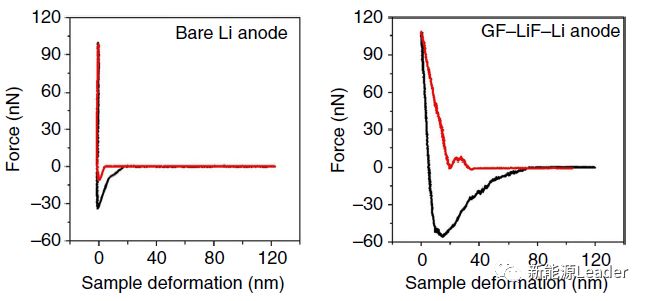 使用AFM测定了两种负极的表面形态,见图5,光锂片上SEI膜的负载和卸载的曲线几乎是重合的,曲线的斜率较大,可以推测出SEI膜比较脆,具有刚性。而GF-LiF-Li负极两个曲线之间存在很大的滞后情况,因而具有更好的弹性。实验测量了两种负极材料的折减模量,光锂片上SEI膜是600MPa,而GF-LiF-Li负极只有130MPa,再次证明了GF-LiF-Li负极材料具有更好的弹性,不容易开裂。