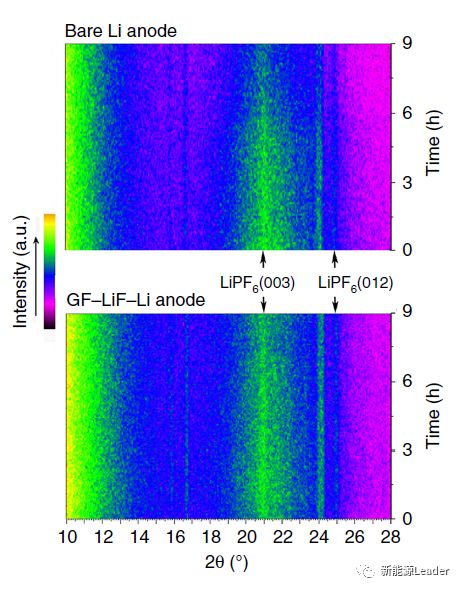 用原位XRD实时监控GF-LiF-Li电极电池在恒电流下第一次充放电反应,过程显示其衍射曲线峰很稳定,而光锂片在相同条件下,LiPF6(003)和LiPF6(012)的峰的颜色逐渐减弱,见图6。两者的第一次XRD扫描图谱也有一致的现象,这说明了在含有光箔锂的电池中,由于SEI膜的形成和锂枝晶的产生,电解液分解了。这也验证了有了GF-LiF的保护层,电解液和锂金属就不会发生反应。