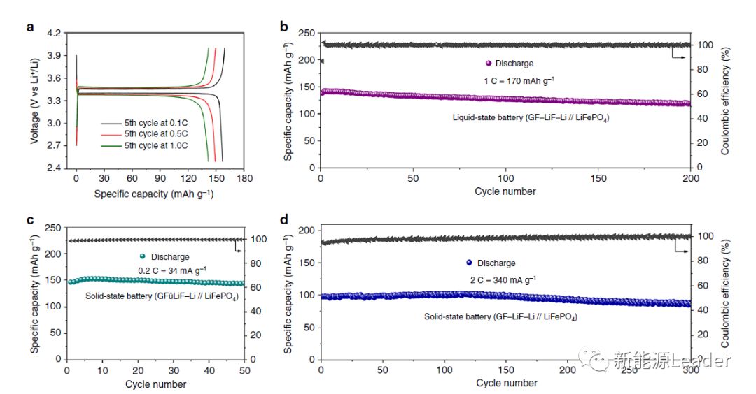 图6-a 液态电解液GF-LiF-Li/LiFePO4电池不同倍率下的电化学性能;图6-b GF-LiF-Li/LiFePO4电池循环性能;图6-c,b 固态电解质GF-LiF-Li/LiFePO4电池不同倍率下的循环性能