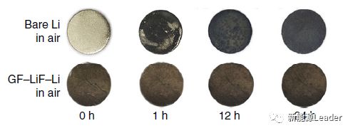 为了进一步验证GF-LiF-Li电极的稳定性,让GF-LiF-Li电极和光箔锂在大气环境中分别暴露12小时和24小时,然后和LiFePO4组装成电池,测试其电化学性能。在含有GF-LiF-Li电极的电池里,不同暴露时间的电池性能和未暴露的电池性能几乎一样,在1C倍率下,可逆克比容量在140 mAh.g-1,相比之下,暴露了12小时的光箔锂组装成的电池性能很不稳定,在70次循环后可逆克比容量仅有40 mAh.g-1,暴露了24小时的光箔锂几乎完全被腐蚀,组装成的电池也没有了容量,见图9。