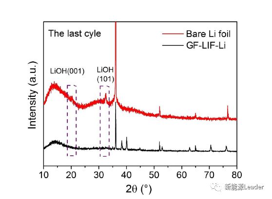 首先用观察法比较了两种电极的稳定性,光箔锂在惰性气体里呈光滑的银色,当放在相对湿度为20%-35%的空气里时,表面很快变粗糙,且成暗黑色。而GF-LiF-Li电极并没有显著变化,充分显示出GF-LiF保护层的疏水性和良好的保护性能,见图7。接着用原位XRD实时监控检测,研究了两者的氧化过程。刚开始两者都是各自特征峰,在10%的相对湿度下,暴露5个小时后,光箔锂出现LiOH的特征峰,这是金属锂和水反应的产物,见图8。而GF-LiF-Li电极没有发生变化。对GF-LiF-Li电极暴露前后进行XPS检测也证实了其优异的稳定性。