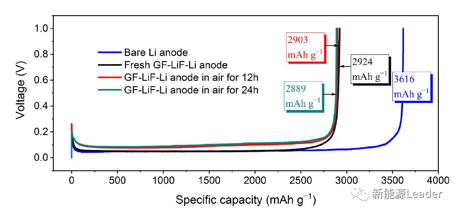 最后又组装了四批半电池,分别以光箔锂,未暴露的GF-LiF-Li,暴露了12小时和24小时的GF-LiF-Li为负极,在相同的电流密度下测试其克比容量,分别为3616 mAh.g-1,,2924 mAh.g-1,,2903 mAh.g-1,,2889 mAh.g-1,由此可见,约有81%的锂在GF-LiF-Li电极中是活性材料,暴露在空气中后损失也极少,见图10。这就为电池组装提供了更加低成本的环境。更具有实际意义。