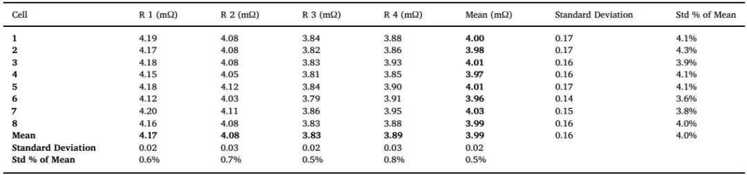首先,作者准备了8个容量20 Ah的锂离子电池,依次让四名不同的研究人员利用相同的测试设备对该8个电池按照IEC 62660-1规定的脉冲功率测试要求(如图1)进行测试。如表1所示,脉冲功率测试得到的内阻标准偏差在0.5-0.8%区间,表明电池本身的一致性和四名不同研究人员实验的重复性是很好的。但如表1最后一列所示,对同一块电池,四名研究人员测试内阻的偏差高达4%,四名研究人员测试结果的不同在图2中可以明显观察到。