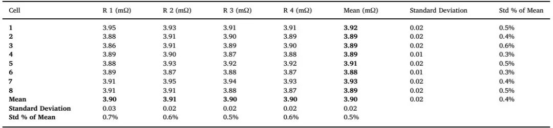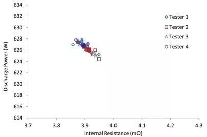 表1. 四名研究人员对相同8个电池进行脉冲功率测试结果对比。