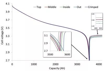 如图5所示,当电压线布置在不同的位置时,电池的放电曲线也存在差异。电压线监测的是开路电压,外电阻越大放电时越快达到放电截止电压,反之亦然。当电压线如图4b布置在连接块顶部(top)时,电流回路最长,因此放电持续时间最短;而当电压线布置在靠近电池Tab附近(inside和out)时,电流回路最短,放电持续时间最长。图4c中将电压线和电流线进行绞合连接的主要目的在于提高测试的可靠性和可重复性。