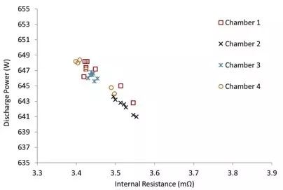 图6. 四个不同温箱得到放电功率vs内阻结果对比。电池为80%SOC,设定温度为25 ℃。
