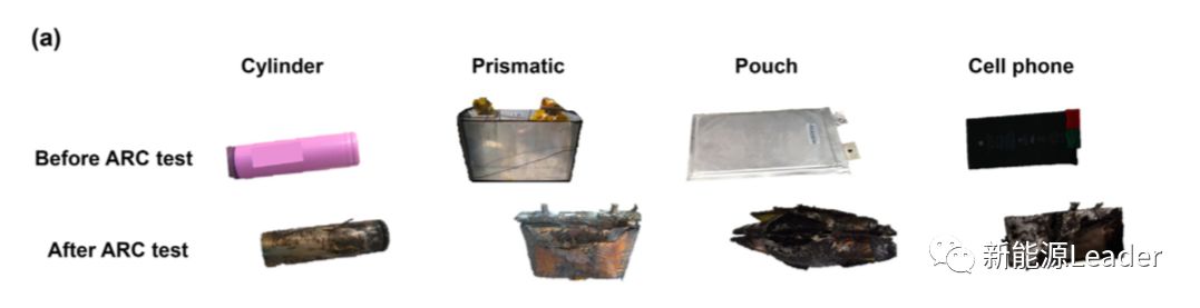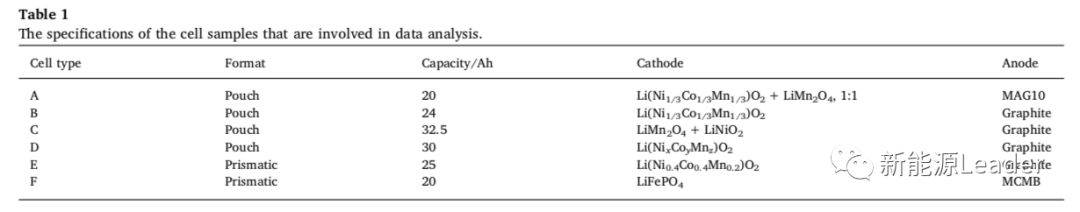实验中作者研究了多种结构锂离子电池,从圆柱形,到方形和软包结构电池,电池的容量也从1Ah到50Ah,能量密度从80Wh/kg到280Wh/kg,正极材料包含LFP、LMO、NCM和NCM+LMO混合,负极包括石墨、MCMB、硬碳、Si+石墨混合,隔膜包括PE、PP、PP+PE混合,PI、PET等材质,部分隔膜还具有陶瓷涂层,可以说基本涵盖了目前市场上我们能够看到的大多数的锂离子电池种类。