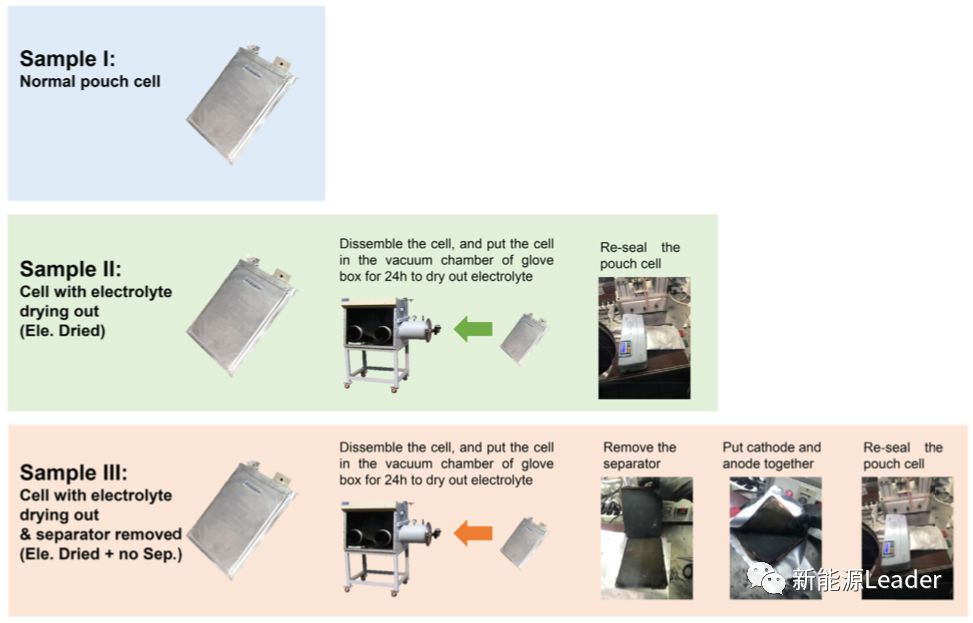 我们知道在锂离子电池发生内短路时,由于锂离子电池通过短路点进行大电流放电,因此短路点处会产生非常高的温度,而短路点的大电流需要有电解液大量的Li+传递作为支撑,因此如果最大程度的减少锂离子电池内部的电解液数量,有助于降低短路点的电流。因此,作者也设计下图所示的三种电池,其中电池1位常规注液量电池,电池2则首先经过解剖后在真空烘箱中进行蒸发干燥,然后再封口,在烘箱蒸干的过程中除去了相当部分的电解液。最后,作者还制作了第三类电池,将软包电池中的电解液充分干燥后移除电池中的隔膜,然后重新将正负极叠在一起,由于电解液被大量蒸发,因此正负极接触2短路产生的热量非常少。