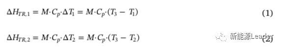 下图为一个典型的锂离子电池ARC测试曲线,根据经验作者给出了三个特征温度T1、T2和T3,其中T1表示锂离子电池开始放热的问题,表明此时锂离子电池内部已经开始发热反应,因此对于锂离子电池而言T1温度越高,则表示锂离子电池越稳定。T2温度表示锂离子电池热失控触发温度,在这一温度时锂离子电池从缓慢升温转变为快速升温,也就是锂离子电池开始发生热失控,通常T2温度越高,则锂离子电池相对更容易通过安全测试。T3则表示锂离子电池在热失控过程中达到的最高温度。在这里作者还定义了两个热量值,一个为热失控过程中的总热量,如下式1所示,一个是剧烈热失控过程中放出的热量,如下式2所示。