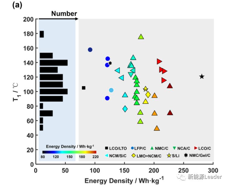 下图a为几种常见体系电池的T1温度分布情况,可以看到所有电池的T1基本上都分布在70-150℃,对于采用石墨负极的电池而言,T1主要表示的负极SEI膜开始分解的温度,多数集中在60-120℃的范围内。