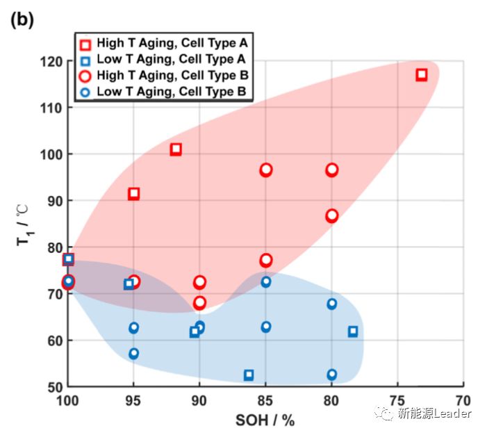 老化对于锂离子电池的热稳定性也会产生一定的影响,下图b展示了A和B两种电池在高温循环和低温循环两种老化模式后的T1变化,可以看到高温循环老化后的电池T1温度出现了上升,而低温循环老化后的锂离子电池的T1温度则出现了下降。作者认为这主要是由于高温循环中,SEI膜会变得更厚、更加稳定,提高电池的热稳定性,而低温循环会促进负极Li枝晶的生长,从而导致锂离子电池的热稳定性降低。