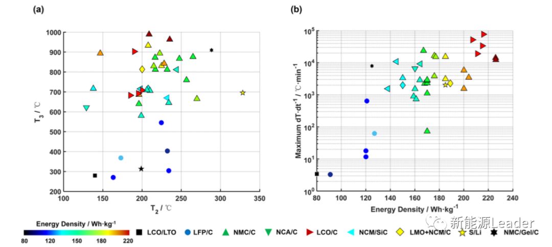 下图a为热失控触发温度T2和热失控最高温度T3之间的关系,可以看到大多数锂离子电池的热失控触发温度都低于300℃,T3是锂离子电池设计中一个非常重要的参数,特别是在考虑电池组热失控扩散时,我们希望电池最高温度能够相对低一些,从而降低热失控扩散的风险。