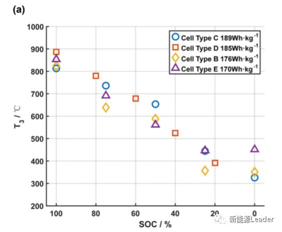 下图a为锂离子电池热失控最高温度T3与SoC之间的关系,实验共测试了B、C、D、E四种电池(电池信息如下表所示),可以看到电池的热失控最高温度T3随着电池SoC的降低而显著下降。